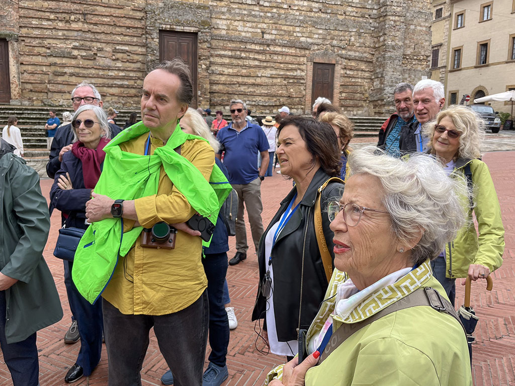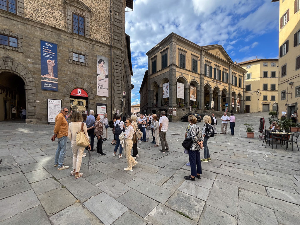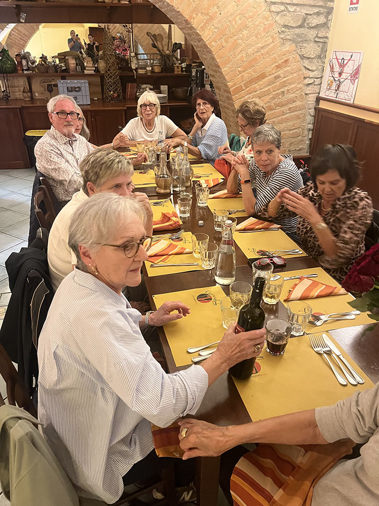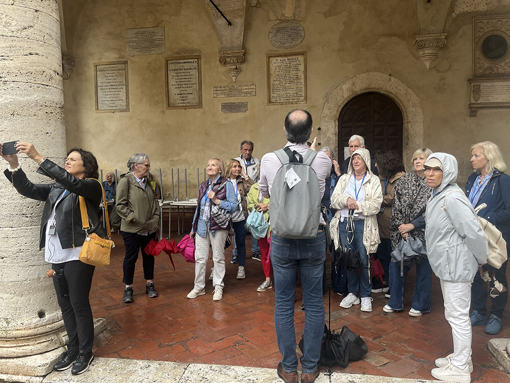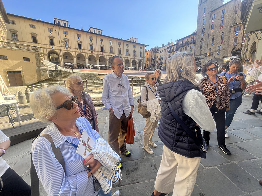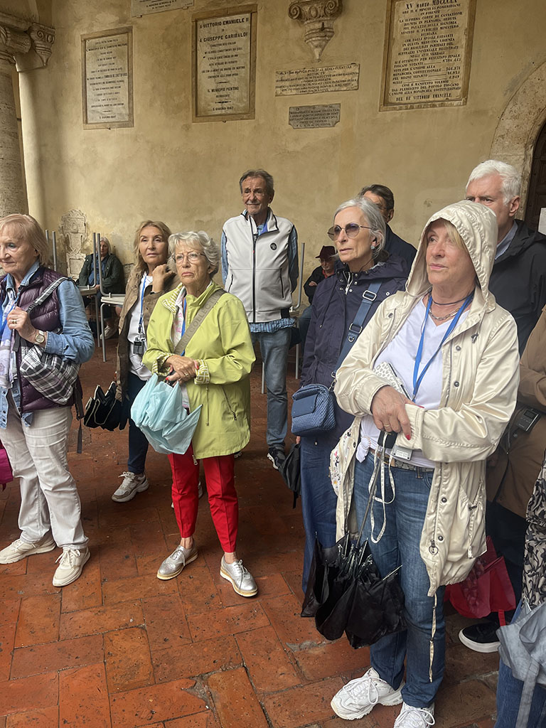 Giornate di grande intensità e di grande bellezza. Viaggio d'andata verso Arezzo. Angelo, l'autista, si è rivelato brillante e molto attivo, oltre a garantire una guida tranquilla e sicura. Primio contatto con Arezzo (albergo centrale e perfetto e cena tutti insieme con pietanze ottime e una tagliata eccellente, solo il vino lasciava a desiderare, ma l'intervento di Marisa ha sistemato le cose. Il secondo giorno (Montepulciano, Pienza e San Quirico d'Orcia) ci ha portato alla scoperta di località meravigliose e suggestive, che nemmeno la pioggia battente ha disturbato più di tanto. Cena al ristorante La Pieve, ottima e abbondante, come si suol dire. Terzo giorno con visita ad Arezzo e partenza con il botto nella cappella Bacci nella chiesa di San Francesco, meraviglia delle meraviglie con la Leggenda della Vera Croce di Piero della Francesca, un capolavoro mozzafiato. Ma Arezzo, località meno battuta dal turismo rispetto ad altre, ha una storia e testimoninianze eccezionali, che le nostre guide Axel e Sandra ci hanno illustrato con grande passione e perizia. Veloce trasferta in bus per raggiungere la tenuta Frassineto con degustazione di vini e naturalmente anche acquisti in abbondanza. Il pomeriggio poi è stato dedicato a Cortona, gioiello assoluto in una regione dai borghi medievali stupendi. Ultimo giorno con alcune ore a Siena, tra il Duomo, il Campo e i vicoli del centro, questo sì affollato di turisti e infine ritorno alla base. Come si diceva nei componimenti delle scuole elementari: stanchi, ma contenti, tornammo a casa. Grazie a Marisa e Mirta, perfette organizzatrici e Teresa, eccellente supporto organizzativo sul posto.
