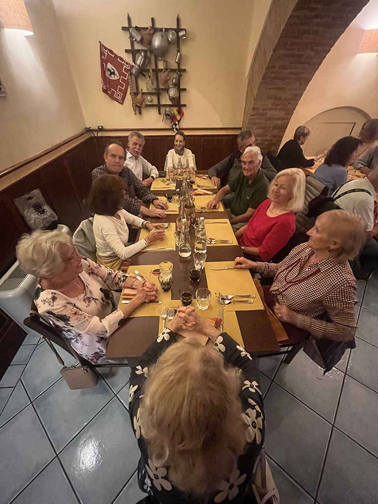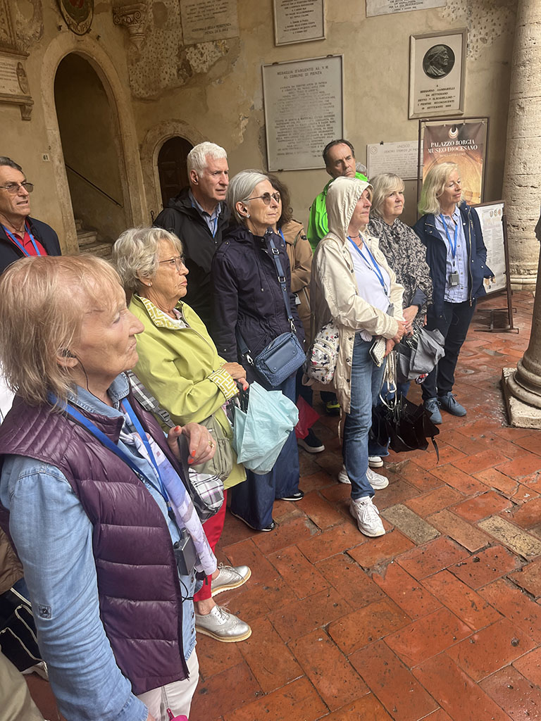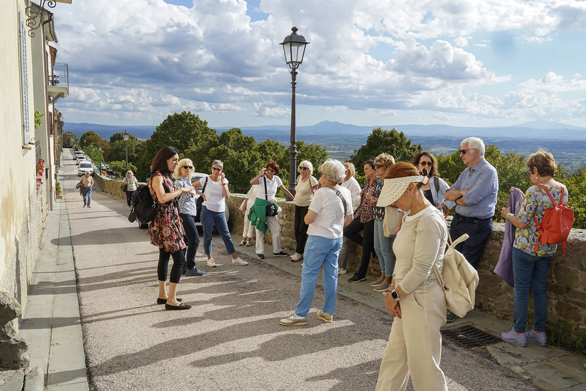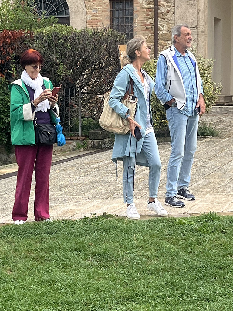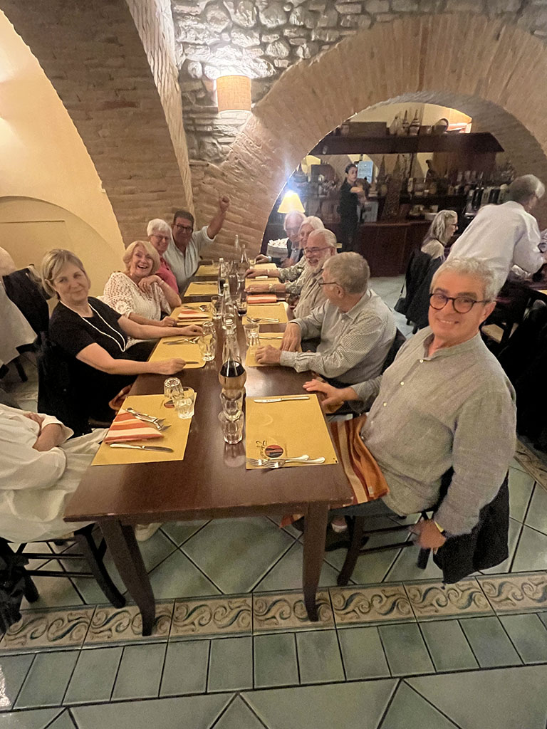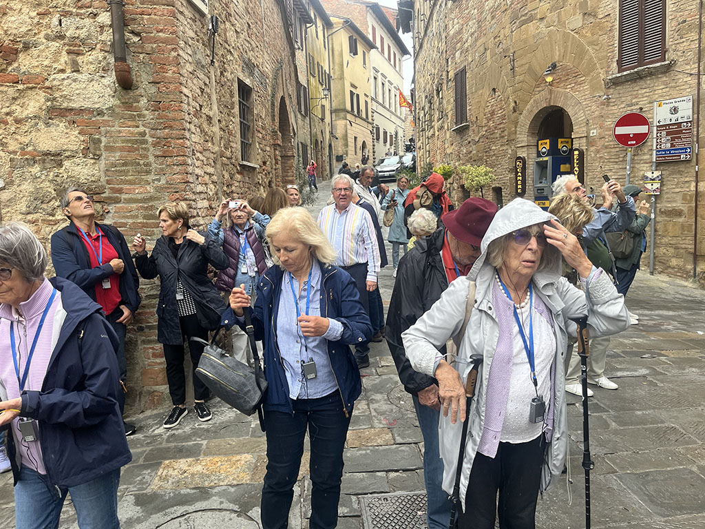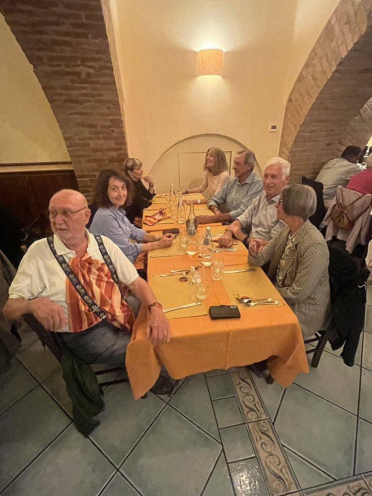 Giornate di grande intensità e di grande bellezza. Viaggio d'andata verso Arezzo. Angelo, l'autista, si è rivelato brillante e molto attivo, oltre a garantire una guida tranquilla e sicura. Primio contatto con Arezzo (albergo centrale e perfetto e cena tutti insieme con pietanze ottime e una tagliata eccellente, solo il vino lasciava a desiderare, ma l'intervento di Marisa ha sistemato le cose. Il secondo giorno (Montepulciano, Pienza e San Quirico d'Orcia) ci ha portato alla scoperta di località meravigliose e suggestive, che nemmeno la pioggia battente ha disturbato più di tanto. Cena al ristorante La Pieve, ottima e abbondante, come si suol dire. Terzo giorno con visita ad Arezzo e partenza con il botto nella cappella Bacci nella chiesa di San Francesco, meraviglia delle meraviglie con la Leggenda della Vera Croce di Piero della Francesca, un capolavoro mozzafiato. Ma Arezzo, località meno battuta dal turismo rispetto ad altre, ha una storia e testimoninianze eccezionali, che le nostre guide Axel e Sandra ci hanno illustrato con grande passione e perizia. Veloce trasferta in bus per raggiungere la tenuta Frassineto con degustazione di vini e naturalmente anche acquisti in abbondanza. Il pomeriggio poi è stato dedicato a Cortona, gioiello assoluto in una regione dai borghi medievali stupendi. Ultimo giorno con alcune ore a Siena, tra il Duomo, il Campo e i vicoli del centro, questo sì affollato di turisti e infine ritorno alla base. Come si diceva nei componimenti delle scuole elementari: stanchi, ma contenti, tornammo a casa. Grazie a Marisa e Mirta, perfette organizzatrici e Teresa, eccellente supporto organizzativo sul posto.